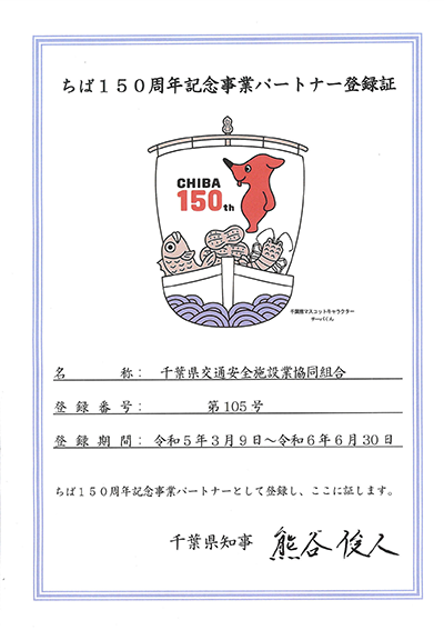 活動報告 令和5年3月 「ちば150周年記念事業パートナー」に登録されました。 当組合は千葉県誕生150周年記念事業における「ちば150周年記念事業パートナー」に登録されました。 今年は、千葉県が明治6年に誕生してから150年の節目の年。 県では本年6月から来年6月までの間「県誕生から150年を振り返り、続いていく未来(100年後)に思いを馳せる」をテーマに、県内各地で記念事業を実施することとしております。 組合では事業パートナーとして広報活動に協力するとともに、イベント開催に向け増加する交通量に備え、観光客並びに県民の「交通の安全・安心な道づくり」に向け協力していきます。 活動報告 令和5年2月10日「新春交流会」を... 令和5年5月19日 令和5年度通常...